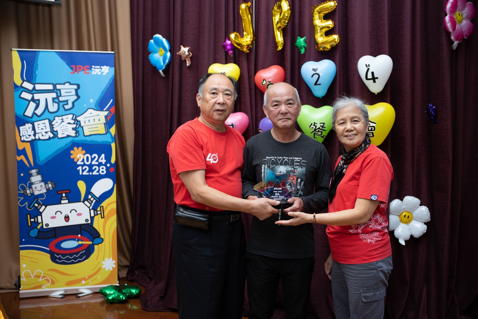 其中JPE特别设立了一个环节,向今年退休的资深胡明进同仁致敬。由JPE大家长凃志兴总经理代表颁发感谢奖杯,伴随着全场响起热烈的掌声,表彰他22年来对公司的辛勤付出与无私奉献,为这位功成身退的同仁送上最深的祝福。在这感动的时刻,也激励着在场的每一位伙伴心向一处,携手奋进。